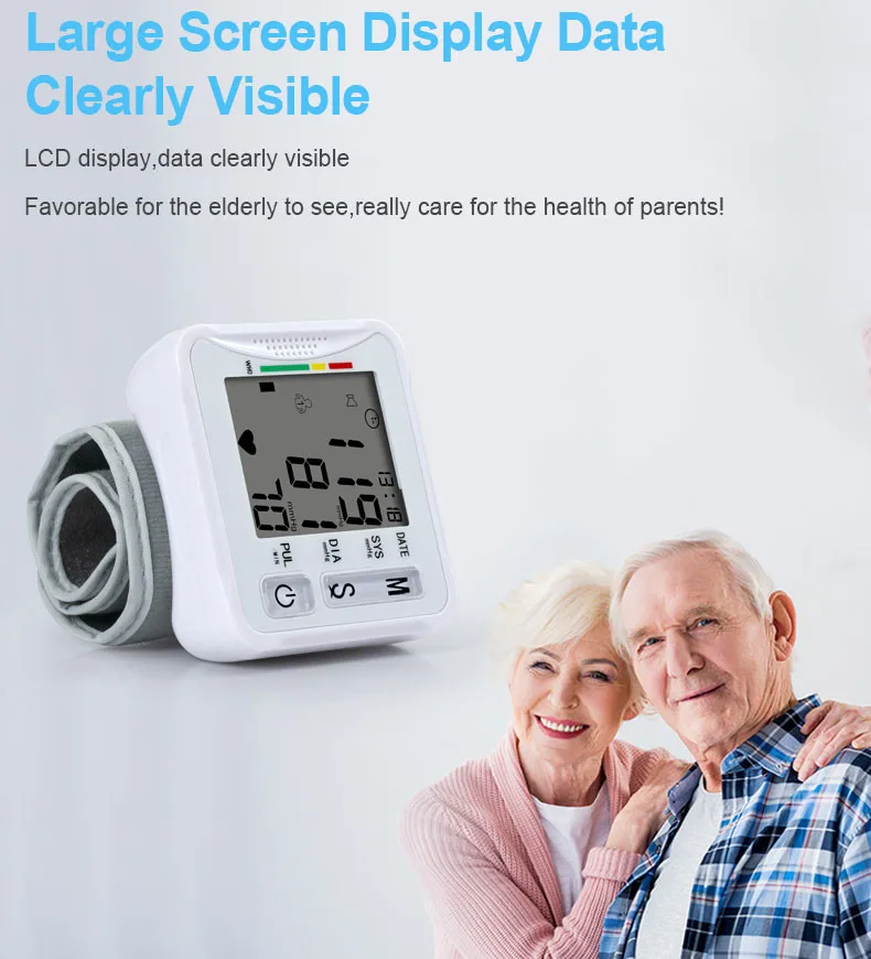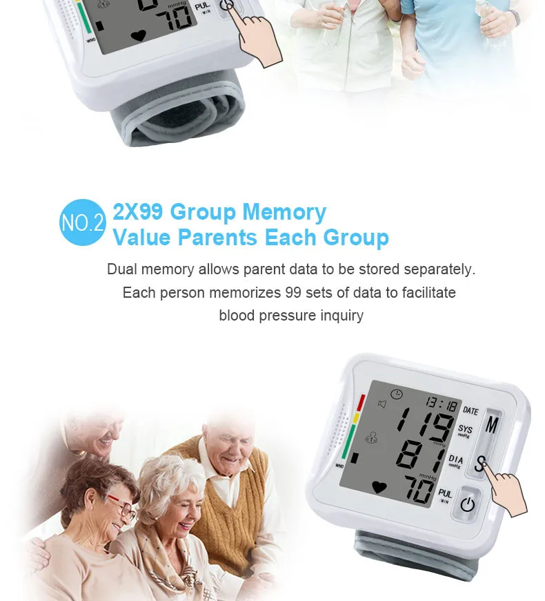 Full Automatic Digital Sphygmomanometer For Test Heart Rate Blood Pressure Meter In Blood Pressure Monitor Electric Plastic CeSpecificationPower Supply ModeRemovable BatteryShelf Life1yearsQuality CertificationCE, RoHSInstrument classificationClass IISafety standardISO13485Applicable partswristMemory value storage99 groupsAccuracy±3mmHg (±0.4kPa)Measuring range20mmHg~280mmHgAppearance size7.56x6.84x3.1CM (without wrist strap)Single weight0.28 KGPacking number60pcsFeatures: 1. Intelligent automatic compression and decompression2. Simultaneous measurement of systolic blood pressure, diastolic blood pressure and pulse3. Simple operation, just press the switch button to test4. Store 99 sets of measured value memories5. Can check single or all measured values6. Three-minute automatic power-off power saving device7. Intelligent debugging device, automatic detection of power8. This machine is suitable for testing range: wrist circumference is 135~195mm9. Large digital LCD screen10. High accuracyProduct Description