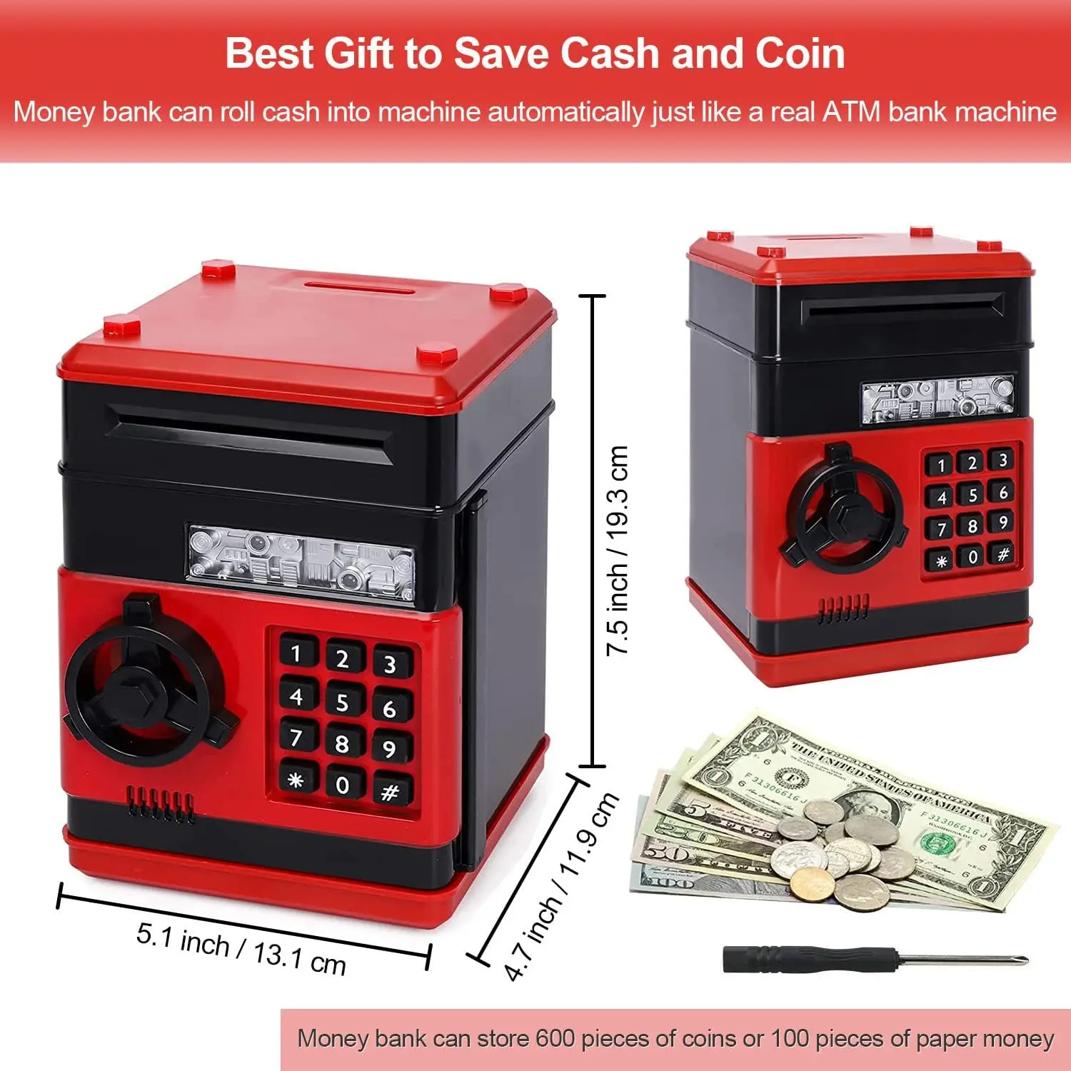 it. Piggy bank with Lifetime Warranty.1) Product Size: 14.2*14.0*18.6CM2) Material: ABS plastic+Electronic parts3) can check the balance, modify the password.4) canautomatically identify coins5) coin automatic report and the total amount of money from the summary.